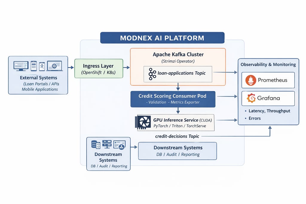 Client systems publish loan application events into a Kafka topic (loan-applications). These events are processed asynchronously by a Kubernetes-based microservice — the credit scoring consumer. The consumer invokes a GPU-accelerated inference service running PyTorch models over CUDA. Once scored, the decision is written back into Kafka (credit-decisions), where downstream systems can consume it independently.
