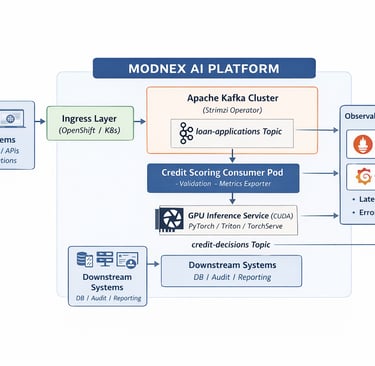 At ModNex, we designed and implemented a production-style streaming AI architecture that demonstrates how modern cloud-native technologies converge to power intelligent decision systems. While our initial implementation was validated in a local lab environment, the architecture itself reflects a scalable, enterprise-ready design that can be deployed across full Kubernetes clusters or Red Hat OpenShift environments.